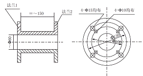 用钢材做成如图六形状的过渡架,过渡架的法兰能直接焊在炉墙外壁上或埋入炉墙中,但要求气密牢固。过渡架另一端法兰是为固定检测器而设,因此必须与检测器固定法兰的螺孔相匹配。如果用Ф12mm安装孔,则在过渡法兰的Ф130mm圆上均布四个Ф12mm安装孔,使用4个M10×40的螺丝,将它与检测器的固定法兰紧固,为防止漏气,两法兰间可填充橡胶纸板密封圈。