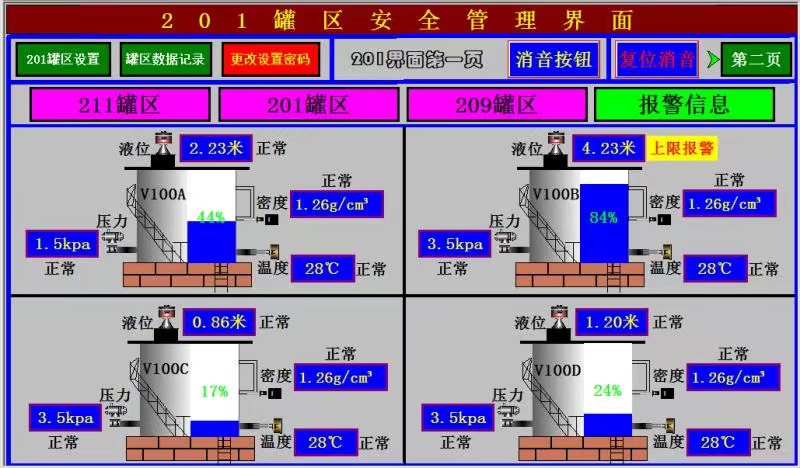 监控中心通过监控软件接收各现场传回的监测数据,并在软件界面上可随时查看各储油罐的液位、温度信息,而且一旦某个储油罐的液位、温度数据超过上限或下限,系统会自动报警。