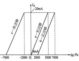 仍假设变送器的量程为5000Pa,而hpg=-7000Pa,则当H=0时,△p=-7000Pa,调整变送器的零位迁移弹簧,使变送器输出为4mA;当H=Hmax;时,△Pmax=5000-7000=-2000Pa,变送器的输出应为20mA。变送器的特性曲线如图4—10中曲线c所示,由于调整的压差△p是小于零(作用于负压室)的附加静压,则称为负迁移。