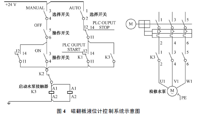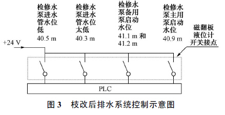 现场安装磁翻板液位计时, 装置标尺的0 位, 对应的实地高程为EL .40 .0 m 。浮子开关设定5 个水位动作值, 检修水位低开关量报警值对应的高程为40 .3 m ;停止所有检修水泵的开关量, 所对应的高程为40 .5 m ;启动主用检修水泵的开关量, 所对应的高程为40 .9 m ;启动检修水泵主用泵的开关量, 以及要求手动启动大泵, 并作为水位高报警上送上位机, 所对应的高程为41 .1 m 与41 .2 m , 两个开关量并列接入。全部开关量分别送入PLC , 如图3所示。