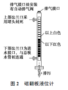 由于在磁翻板液位计的进水接口法兰处安装有阀门, 在平时不需要水泵水轮机排水检修时, 该阀门处于关闭状态, 必要时可以通过装置底部的排污阀门把液位计主导管内的水排空。