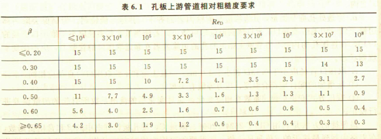 表6.1列出了孔板流量计上游管道相对粗糙度的上限值,单位是10'Ra/D,其中,Ra为偏离被测轮廓平均线的算术平均偏差。