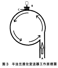 如图3所示,A点和B点与图2相同,C处为罐壁到取压点之间的一块静水域,这块静水域的存在,隔离了罐内涡流与平法兰液位变送器正压膜片,使变送器在B点测量出的压力是不受漩涡水流影响的桶内水压。我公司在确定好方案后,通过与厂家联系,将插入式单法兰液位变送器全部返厂改装成平法兰液位变送器,通过改造,彻底消除了冷凝水平衡桶液位数据失真的情况,目前该仪表运行平稳。