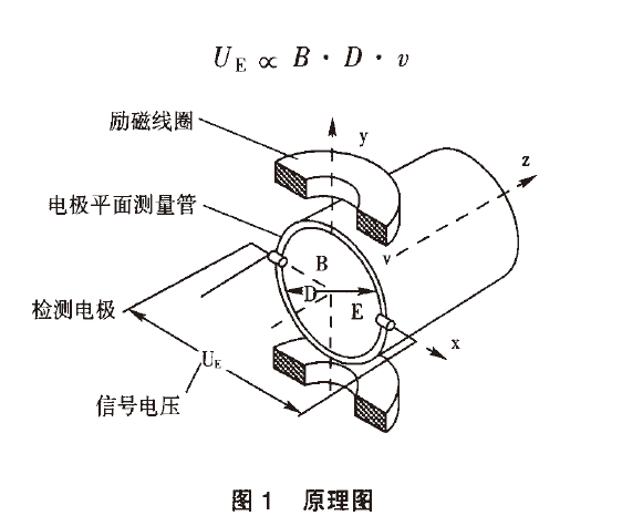 电磁流量计的基本原理是以法拉第电磁感应定律为基础,即导体在磁场中作切割磁力线运动时,在其两端产生感应电动势。该原理用于测量管道内流动的导电性流体。导电性液体在垂直于磁场的非磁性测量管道内流动,并且流体流动的方向与磁场方向相垂直(见图1),