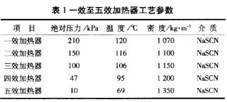 相同类型的差压变送器,一效至四效加热器液位变送器测量准确,而五效加热器液位变送器液位出现异常波动,一效至五效加热器工艺参数如表1所示。从液位变送器测量原理可以得出,与液位测量有关的工艺参数有压力、温度、密度及被测介质等。