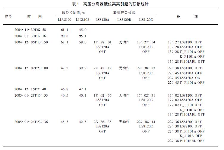 该装置自投产以来多次由于高压分离器(V1101)液位测量故障发生装置联锁停工,表1为2004年11月至2005年2月联锁停工统计见表1所列。
