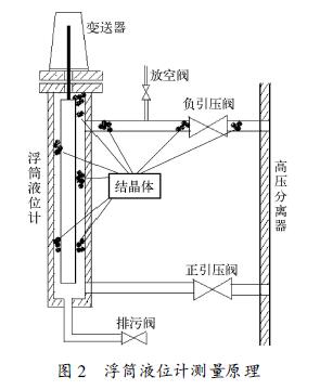 b)关闭浮筒液位计的正引压阀,关闭排气阀,打开负引压阀,向高压分离器内注水(高压分离器平时工艺操作也在注水,所以不影响工艺操作),这样就可在溶解浮筒内铵盐的同时还能溶解负引压管线中的结晶铵盐。通过上述手段,能基本解决液位仪表由于铵盐结晶造成的测量故障,这只是从仪表方面采取的措施。要彻底解决此类问题,还得从工艺方面采取一些措施,降低铵盐的含量,使其不能产生结晶。