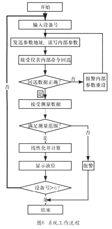 系统工作流程如图6所示。*先对容器设备进行基本测量。输入容器高度E,满载高度F及应用参数A(A是用来将仪表调到满足测量要求的应用参数)。这些参数输入后,由智能显示仪表或计算机得到的操作矩阵将被锁定,以保证设置不受意外情况影响,再对采集到的数据线性化(线性化过程描述了测量电平与罐容量或产品重量间的关系)之后,测量值将在相应部分显示出来。