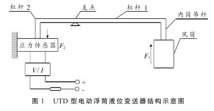 在图1中,电源电压为直流24 V,电流为4}20 mA。由图1可以看出,当风筒的内筒受到液位体向上的浮力F,后,通过杠杆的作用使应力传感器受到一个向下的力Fz为