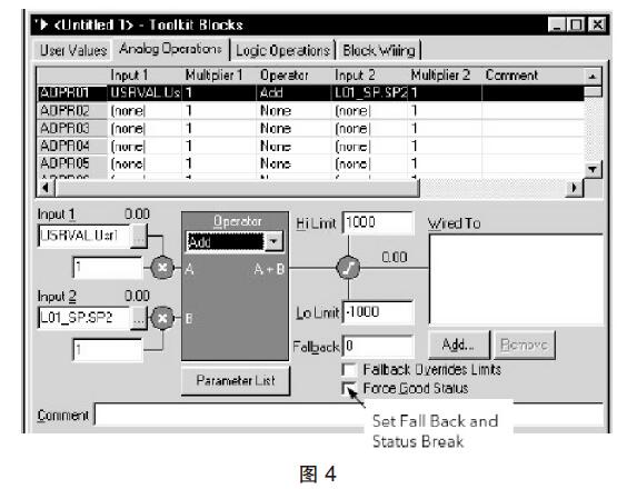 利用Toolkit功能块支持就地的数学运算功能,设置Input1等于电动浮筒液位数据(A),Input2等于磁翻板液位计数据(B),运算A-B,高限HiLimit设50,低限LoLimit设-50,即量程的±5%。输出超限信息控制继电器输出模块,驱动声光报警器,完成图3的液位失真报警功能。设置Toolkit的界面如图4: