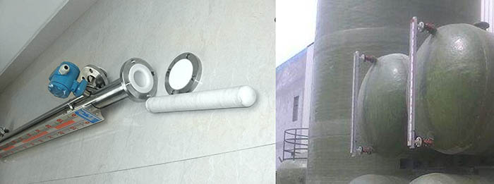 一般情况下,浓硫酸外置液位计可选用浮球式液位计或者磁翻板液位计。单一液位计高度不能满足要求时,可采用多个液位计交替布置,当高度大于4?m时应设中间支撑,并且在液位计与罐体之间设置截止阀门,便于后续维修或更换。