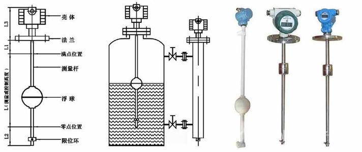 液位计由连通器、主导管、磁性浮子、现场指示牌,及捆绑式液位变送器或液位开关组成。产品利用的基本原理是阿基米德原理(浮力原理)及磁荷同性相斥、异性相吸的特性。当主导管内磁性浮子随液位升、降时,通过磁耦合驱动指示器内磁浮子翻转,实现就地观测和信号远传显示。