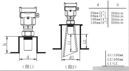 ①在介质反射性好的情况下,容器接管直径大,接管长度可略长于转换器(图1)右边表格列不同直径接管的长度推荐值。此时的接管末端必须平滑、无毛刺,尽可能磨圆。