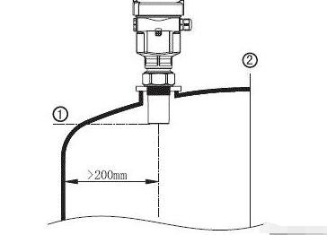 安装时应注意一体化超声波液位计与罐壁至少保持200mm距离。①基准面②容器中央或对称轴