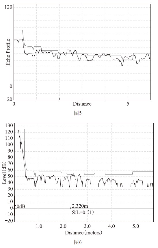 承上文可以看出,空罐时因罐底聚焦反射现象产生的部分回波信号误识别为真实液位回波,但故障回波幅值实际较真实液位回波的幅值相差较大,只需提升回波曲线的阈值,确保空罐情况下的干扰杂波不超出抑制曲线,保证此时仪表出现丢波报警,输出报警电流,即可彻底解决该故障。维护人员通过设置自动回波抑制,使超声波液位计智能学习空罐的超声返波信号。考虑到故障信号存在的随机性,在自动学习的回波抑制曲线基础上,手动适当增加了抑制曲线高度幅值。经验证,该方法有效解决了超声波液位计空罐跳变故障,重新设置抑制曲线后,回波曲线如图6所示。
