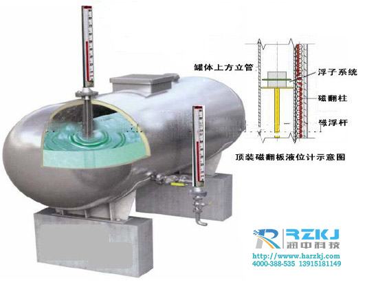 B)磁翻板液位计:腔内安有一个磁性浮子,当浮子通过磁场时显示器就改变了颜色。磁翻板液位计的优势在于它可以处理其它液位计不能处理的局限问题。磁性液位计能测量整个宽度,而且不会有玻璃损坏的现象发生。所以用一个仪表就可以轻松测量10英尺或者更长的范围,就是说不需要更多的到仪表阀的平台。安装时还需要考虑的问题是:磁性液位计在底部与浮子连接的地方需要更多的空间,以便拆除浮子, 因为浮子比一个普通的玻璃仪表要大很多并重很多,也需要更强的支撑。