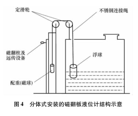 分体式磁翻板液位计的安装步骤如下: ①通过计算浮力和配重, 在槽体顶部合适位置安装定滑轮, 在槽外合适位子安装磁翻板传感装置; ②用直径为 3 mm 的不锈钢绳连接浮子和配重, 钢绳长度根据液位来计算。这里特别要注意, 磁翻板要反向安装。