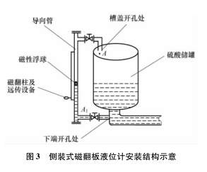 侧面安装方式的关键点在于: ①酸槽内壁衬有瓷砖, 故引流管上开孔应选择槽盖合适位置, 下孔好在进口管上, 且均需加阀门, 便于维护; ②考虑管内硫酸在极端天气时对磁翻柱及测量装置的影响,因本公司循环槽温度在75 ℃左右, 为避免夏天温度过高影响传感器测量, 冬天防冻, 管径 D 应在 80mm 以上可保证正常测量。
