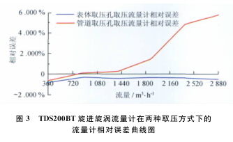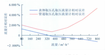 例, 系统运行时间为 6 0s , 标准装置的滞止平均温度为2 9. 7℃ , 空间平均湿度为 4 2% , 流量计的平均温度为2 9. 3℃ , 在表体取压孔取压和管道取压孔取压的流量计检定试验数据分别如表 3 、 4 所示。两种取压方式下的流量计相对误差曲线如图3所示。