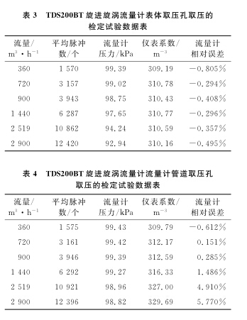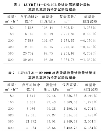 以使用**的D N 1 0 0 B天然气流量计为例, 系统运行时间为6 0s , 标准装置的滞止平均温度为 2 8. 9℃ , 空间平均湿度为 3 0% , 流量计的平均温度为 2 8. 3℃ , 在表体取压孔取压和管道取压孔取压的流量计检定试验数据分别如表 1 、 2 所示。