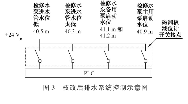 水位点40.9 m、41.1 m、41.2 m的开关量有上升自保持功能;水位点40.3 m、40.5 m的开关量有下降自保持的功能。技改过程中保留了压力变送器的接线,让其模拟量继续上送上位机,只作为显示用,但在检修排水系统逻辑中取消压力变送器控制检修水泵的启停功能,逻辑里增加了由浮子开关来控制检修水泵的启停过程。由于在磁翻板液位计的进水接口法兰处安装有