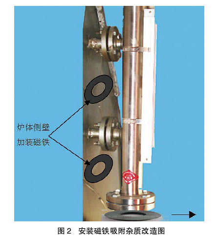 (图2)。通过吸附作用减少进入水位计缸体的杂质,使水位计清理周期延长到5-7天。在此基础上,又在水位计缸体底部法兰外侧加装了1块磁铁,使水位计清理周期进一步延长为7一10天。