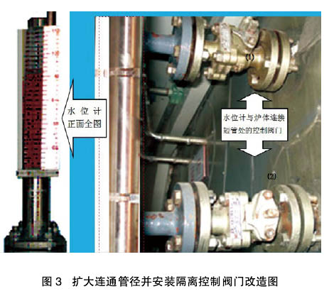 将水位计与炉体之间连通管山原来的ch16mm更换为ch20mm的管段,并安装两个控制阀门,通过关闭阀门(1)和(2),实现水位计与炉体隔离(l图3)。这样,拆卸水位计时既小需要排低炉水,也避免了对加热炉真空度的影响。