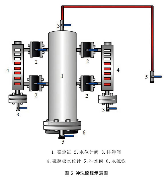 (2)拆下永磁铁关闭4个水位计阀,打开稳定缸上、下阀及阀门5,单独冲洗主稳定缸。