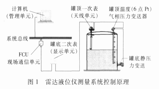 见图1,安装在罐底的压力变送器和罐顶的6铂电阻温度、压力变送器的信号汇入罐顶一次表,再汇入罐底二次表。二次表是显示单元,可显示液位、温度、压力等数据, 接入现场通信单元(FCU),计算机也接入FCU,对所有FCU 上的液位仪表进行管理。