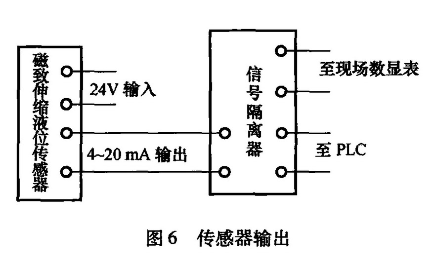 硝酸铵溶液贮罐的液位信号加入了硝酸铵溶液应用控制系统中,给控制系统的分层保温、液位显示、余料监测、生产投料提供了贮罐液位的数据。MTS液位传感器自带变送输出,其与控制系统连接如图6所示。