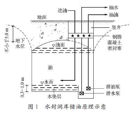 1.1 储油原理水封洞库通过人工在地下岩石中开挖形成,其密封是通过地下水向洞内渗透实现,即水封洞库必须建在稳定的地下水位线以下一定的深度,洞罐的埋深与洞室储存介质的大工作压力、工程地质和水文地质条件、稳定的地下水位等因素有关,其埋深应保证洞库周围的地下水压力大于洞内储存介质的压力。正常储存时,洞外部地下水压力大于洞内介质压力,地下水只能向洞内渗透,而洞内介质不能向洞外渗漏,同时利用油比水密度小以及油水不能混溶的特点[5],渗入洞内的水沿洞壁汇集到洞底部形成水垫层,从而达到将所储介质封在洞内的目的。渗入洞内的水可由油水界面检测仪表进行检测,待达到一定高度时,用安装在洞内的潜水泵将水排出洞外[6]。水封洞库储油方法有固定水位法和变动水位法,采用变动水位法储油新鲜水的需求量和污水处理量大,运行费用高,因而目前多采用固定水位法,储油原理示意[7]如图1所示。