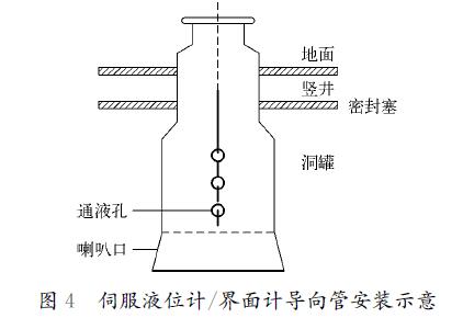 仪表安装应便于仪表维护、更换及观测,仪表的观测面应朝向操作通道,周围不应有妨碍维修仪表的物件[9],因而洞罐液位计、界面计和多点平均温度计的变送单元均安装在竖井口。考虑到洞罐埋设深度及洞罐仪表检测元件的长度,为便于仪表安装,保护洞罐仪表的检测元件,为伺服液位计、伺服界面计及多点平均温度计设置了液位计、界面计导向管及温度计保护管。导向管、保护管安装时,从上到下的垂直误差一般小于导向管、保护管口径的10%,并彻底处理好导向管通液孔的毛刺;焊接必须采用套焊,焊缝必须清理干净;安装时,必须保证洞罐仪表与导向管、保护管连接法兰的水平度,一般控制在1°[10]之内,伺服液位计、界面计导向管安装示意如图4所示。