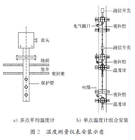 温度测量方式:1)采用多点平均温度计,安装示意如图2a)所示;2)采用单点温度计用组合套管安装的方式,将几支单点温度计组合安装在一根不锈钢套管内,测量不同高度油品的温度。单点温度计与液位开关合用1根套管,安装示意如图2b)所示。