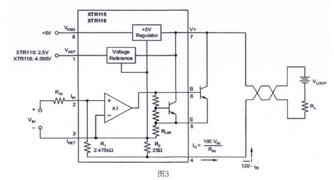 把传感器输出的不同电压转换成标准的4-20ma输出,可采用不同的电路形式。成本低的可采用分立器件,但是为了达到比较高的精度,要保证相应器件的匹配程度,调试也比较麻烦。传感器专用的4-20ma 的一体化变送器集成电路,采用该系列产品设计的变送器成本低,精度高,调试简单。经过选择决定使用完成设计。内部结构如图三: