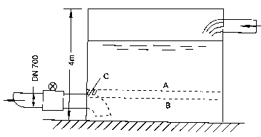 案例4 广西某水厂在郊区山头设置清水池,利用水池高度势能发送成品水。运行人员反映计量出水量的DN700mm电磁流量计有时候流量显示不稳。晃动达百分之十几到百分之二十,误差也大,估计相差约20%。现场考查发现水池如图7-9所示安装流量传感器,水位高度不足就会卷入气泡,甚至流量传感器测量管内不能充满。如水位降至A线时,虽高出吸入口**,但高出不多,还会在C处产生旋涡,将水位表面空气卷入形成气泡,使显示晃动;若水位降到B,测量管将不满管。我们建议如图虚线所示装一弯头,扩大水池有效容量,减少吸入气泡的机会,弥补原设计的不足。这类实例是经常遇到的。