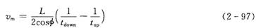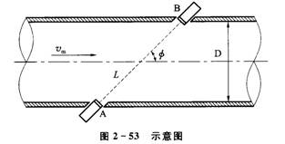流量计以测量声波在流动介质中传播的时间与流量的关系为原理。通常认为声波在流体中的实际传播速度是由介质静止状态下声波的传播速度和流体轴向平均流速( Vm)在声波传播方向上的分量组成。按图2-53所示,顺流和逆流传播时间与各量之间的关系是