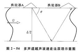 采用超声检测技术,通过测量超声波沿气流顺向和逆向传播的声速差、压力和温度,算出气体流速及标准状态下气体的流量。其原理如图2-54所示。