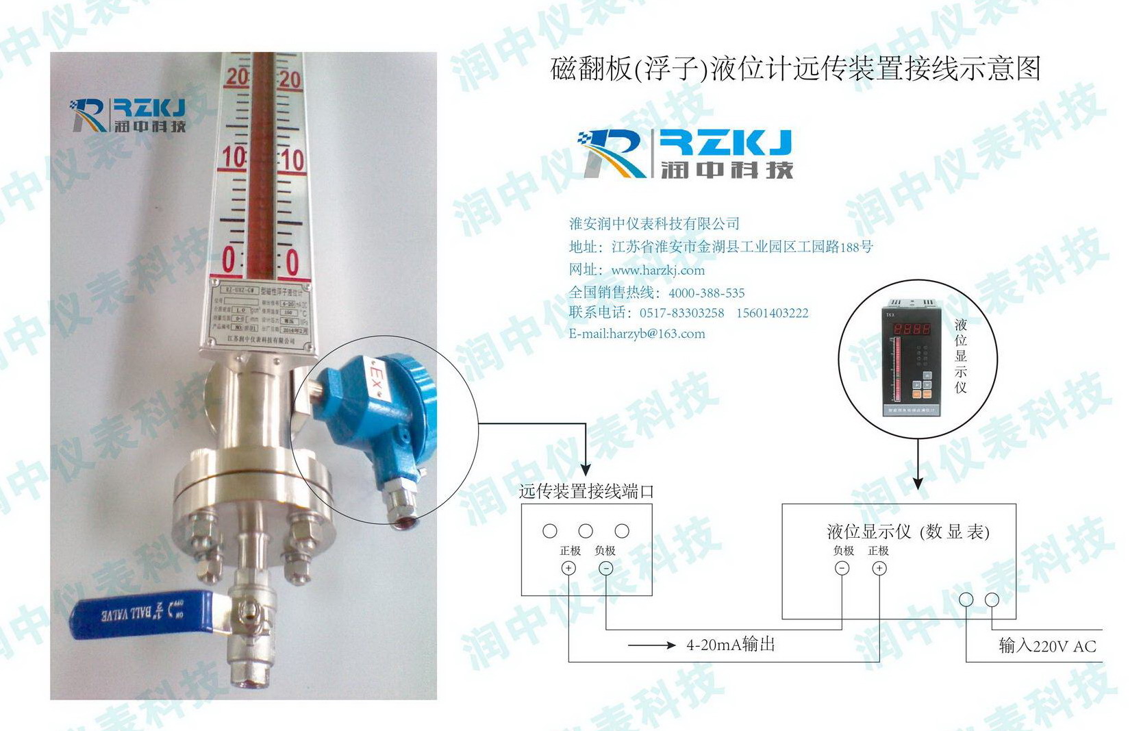 3、 安装完毕后,需对显示器的浮子用磁钢引导一次使零位以上显示白色,零以下显示红色。